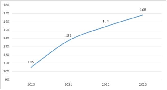 图表:2020-2023年中国羽毛球行业规模(单位:亿元)