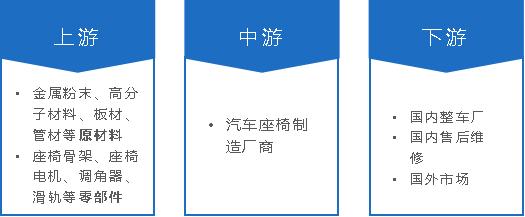 汽车座椅作为重要的汽车零部件,在整个汽车产链中处于承上启下的位置,汽车座椅行业的产业链上游涉及金属粉末、高分子材料、板材、管材、棒材等原材料及零部件;中游主要是华域汽车、安道拓、李尔、丰田纺织、麦格纳、佛吉亚等汽车座椅制造厂商;终端应用行业为整车制造。