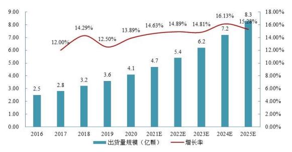 图表:2016-2025年我国安防监控镜头出货量及增长率情况