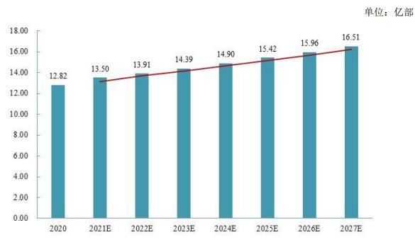 根据IDC数据,全球智能手机出货量,在2020年达到12.82亿部,预测从2023年至2027年,全球智能手机出货量规模预计将由14.39亿部,以3.5%年均复合增长率增长至2027年的16.51亿部。