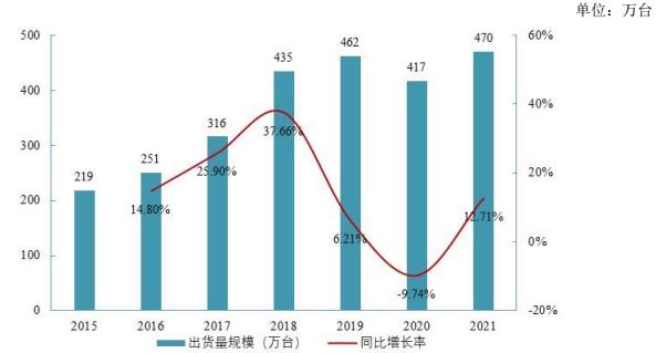 图表:2015-2021年中国投影机市场总出货量规模及增长率情况