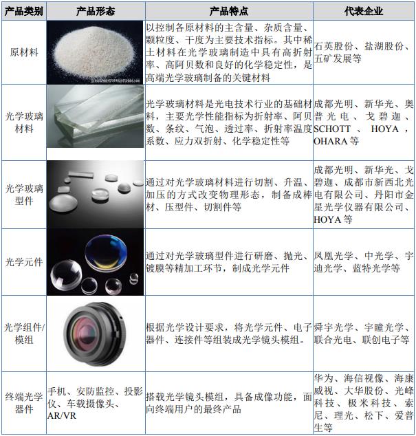 图表:光学玻璃产业链各环节产品及其典型企业