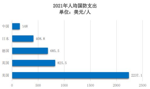 在人均国防支出方面,中国与世界发达国家存在着较大差距。2021年美国的人均国防开支为每人2,237.1美元,英国的人均国防开支为每人825.5美元,德国的人均国防开支为每人685.5美元,日本的人均国防开支为每人408.8美元,而中国的人均国防开支每人仅148.0美元。