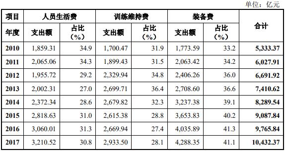 国防部2019年发布的《新时代的中国国防》白皮书中,对近年来我国国防费用构成进行了披露,按用途划分,主要由人员生活费、训练维持费和装备费构成,其中装备费用于武器装备的研究、试验、采购、维修、运输、储存等。2010年至2017年,我国国防费用各项开支占比情况如下: