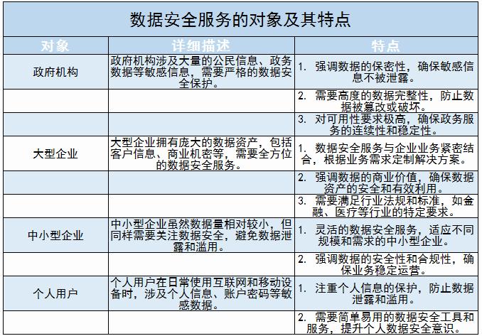 此外,数据安全服务行业还涉及系统安全服务和业务安全服务。系统安全服务主要关注保障系统安全的各个方面,包括访问控制、入侵检测与响应、防病毒部署等。业务安全服务则注重业务流程中的安全性,通过供应链风险评估、合同审查、员工安全意识培训等服务,确保业务过程的顺利进行。