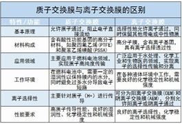 质子交换膜与离子交换膜的区别从表格中可以看出,质子交换膜与离子交换膜在基本原理、材料构成、应用领域、工作环境、...