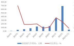 图表:2014-2023年中国新能源汽车销量