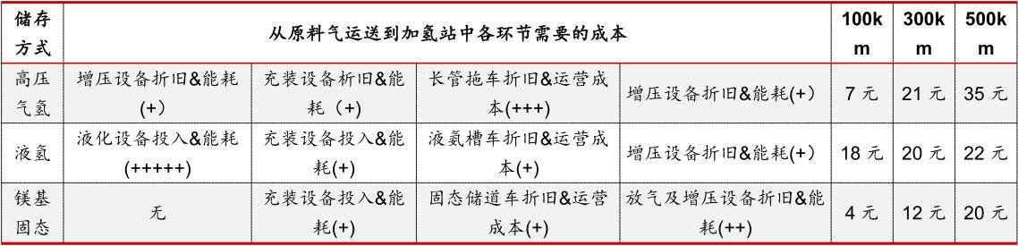 由于无需原料气压缩/液化设备投入,固态储氢的运营成本相较高压与液态两种储存方式具有明显优势。根据氢储科技的测算,在实现规模化运输的条件下,当运输半径为100公里时,高压气氢的运营成本为7元/公斤,液氢为18元/公斤,镁基固态储氢为4元/公斤;当运输半径扩大到300公里,高压气氢的运营成本陡然上升,至21元/公斤,对比液氢20元/公斤,镁基固态储氢12元/公斤;当运输距离扩大到500公里时,高压气氢的运营成本已经增加到35元/公斤,液氢增加到22元/公斤,镁基固态储氢上升至20元/公斤。