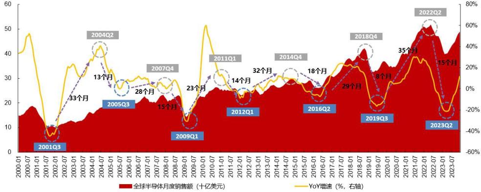 2000年以来半导体产业经历了6轮周期。结合半导体行业销售额规模和增速来看,从2000年起,半导体产业共经历了6轮周期,每轮周期约4年左右,上行周期通常为2-3年,下行周期通常为1-1.5年。2019年,受需求不振及存储器价格大幅下跌影响,全球半导体行业进入下行周期。2019Q3见底后,5G、新能源车等领域爆发驱动半导体需求增长,至2021Q3行业景气度持续上行,并形成全球范围内的“缺芯潮”。2021Q3后,半导体下游需求出现结构性分化,消费电子增速放缓。2022Q2以来受疫情影响,经济增速放缓,全球半导体行业进入下行周期。随着新一轮来自人工智能、数字经济和智能汽车的创新催化,全球半导体销售额增速在2023Q2出现拐点。