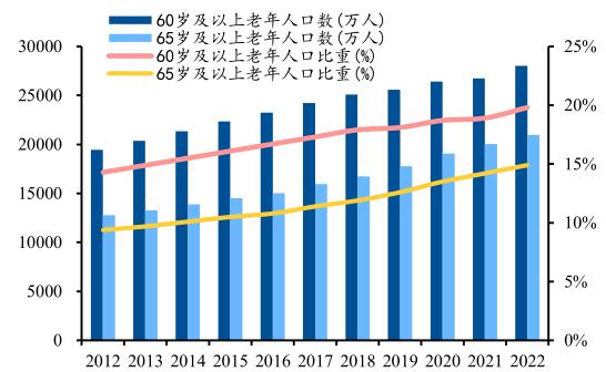 2022年全国60岁及以上人口为2.8亿人,占比19.8%。据国家卫生健康委测算,2025年左右,60岁及以上老年人口总量将突破3亿,占比将超过20%,进入中度老龄化阶段;2035年左右,60岁及以上老年人口将突破4亿,占比将超过30%,进入重度老龄化阶段。