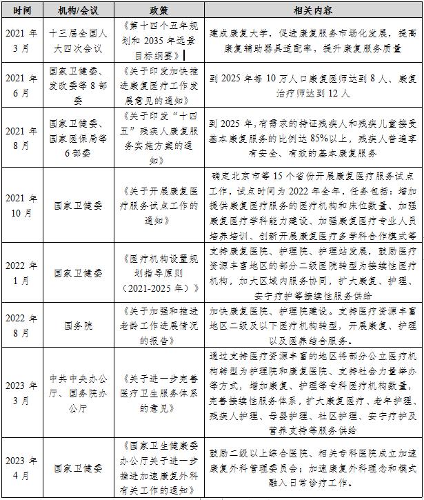 2021年以来国家接连出台政策文件,支持康复医疗行业发展。2021年6月,国家卫健委等8部委发布《关于印发加快推进康复医疗工作发展意见的通知》,定下2025年每10万人口康复医师达到8人、康复治疗师达到12人的目标;2023年3月,中共中央办公厅、国务院办公厅发布《关于进一步完善医疗卫生服务体系的意见》,支持社会办医、增加康复等专科医疗机构的数量。随着国家对康复医疗给予的重视程度越来越高,行业未来有望迎来快速发展。