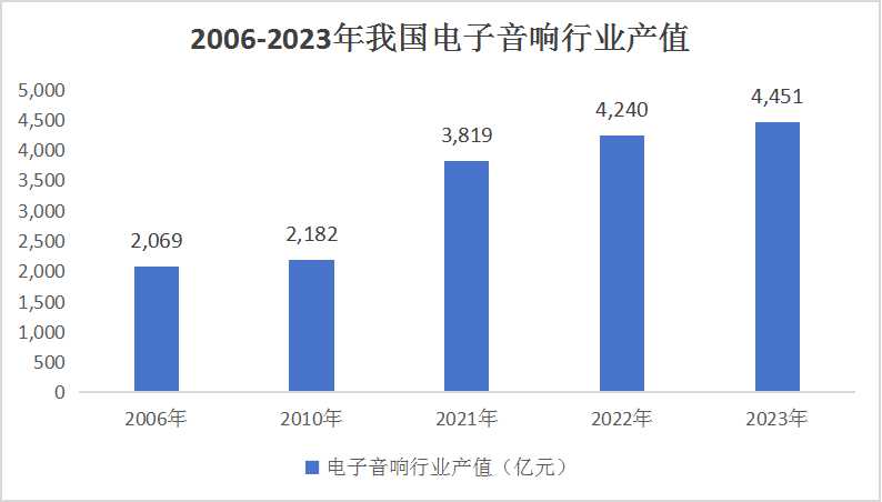 我国电子音响行业起步于 1979 年,有着深厚的历史积累。自 1999 年开始,我国电子音响行业产值以每年超过 30%的速度增长,至 2006 年产值已达 2,069 亿元,2006 年后行业整体发展进入平稳增长阶段。2010年达到2,182亿元。之后继续上升,2021 年行业总产值增长至 3,819 亿元,到2022年增长至4240亿元,预计 2023年行业总产值将达到 4,451 亿元。经过三十多年的不断发展,我国电子音响设备行业目前处于平稳发展阶段,近五年行业平均增长率为 6.82%。