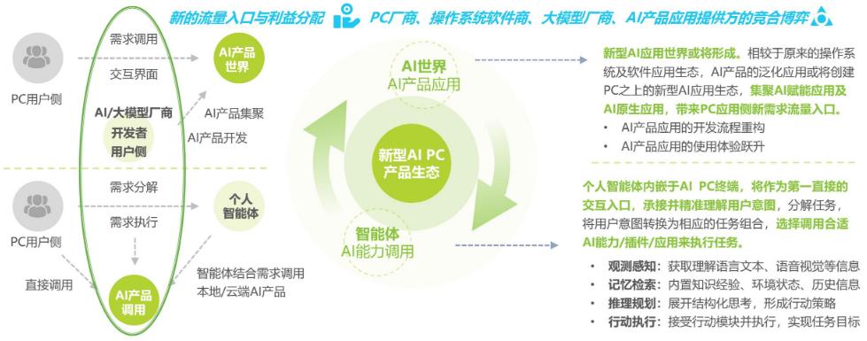 随着大模型、生成式AI技术的到来,其强大的数据处理、学习泛化与内容生成能力,高质效加速了各行各业人工智能技术的赋能进程。2024年更多AI应用如雨后春笋,呈现爆发增长态势。无论是个人智能体,还是基于大模型底座的新型Al应用生态,都将可能成为承载用户AI功能需求的巨量流量入口,大模型厂商、操作系统厂商、AI应用厂商及PC厂商纷纷投入布局。作为重要的终端硬件载体,PC厂商的角色与责任将变得更加重要,将集聚各方产业资源,与各方形成竞合关系,从用户角度出发,让客户自由选择本地化处理或云端协同,达到本地数据隐私安全与云端强大功能调用的最大利益平衡点。