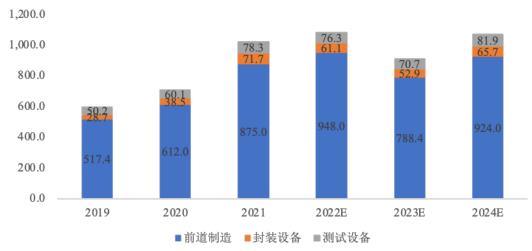 根据SEMI发布的数据,全球半导体设备市场规模到2024年将增长至1,071.6亿美元。以产业链应用环节来划分,半导体设备主要应用于前道工艺设备(晶圆制造)和后道工艺设备(封装测试)两个大类,前道设备占据了整个市场的80%-85%,其中光刻设备,刻蚀设备和薄膜沉积设备是价值量最大的三大环节,各自所占的市场规模均达到了前道设备总量的20%以上。
