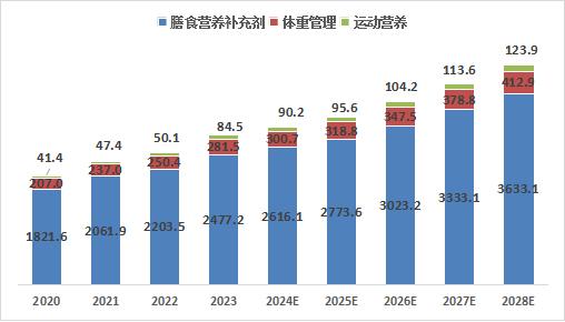 图:2020-2028年中国营养健康消费品行业市场规模(单位:亿元)