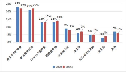 图:2020、2025年中国膳食营养补充剂市场不同原料占比