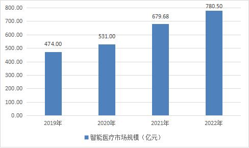 图表:2019-2022年智能医疗市场规模(亿元)