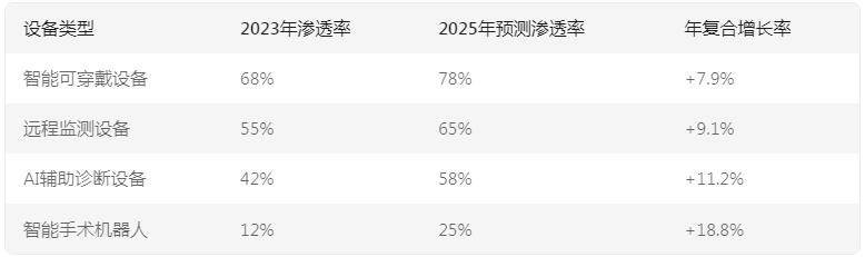 从产品类型看(表1),我国智能医疗设备技术渗透率呈现加速态势: