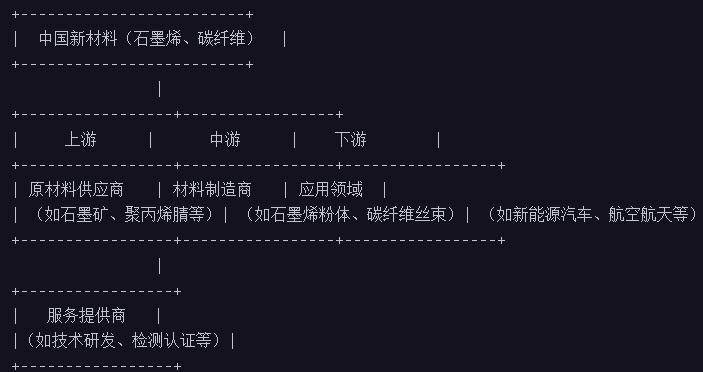 中国新材料(石墨烯、碳纤维)产业链涵盖了上游的原材料供应商、中游的材料制造商和下游的应用领域以及服务提供商。