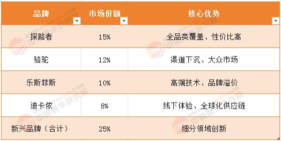 第二梯队:本土头部品牌如探路者、骆驼,通过性价比与渠道下沉策略覆盖大众市场(市场份额40%)。