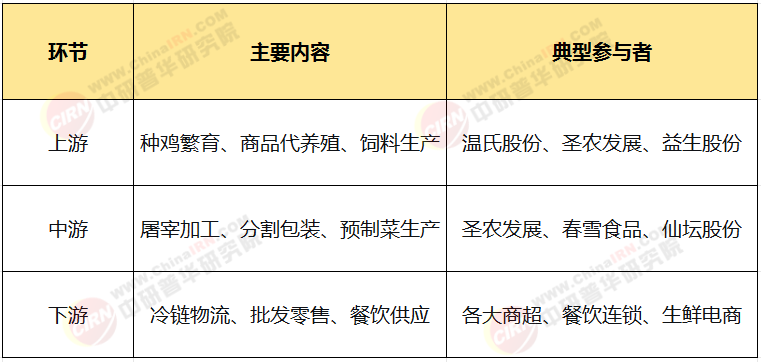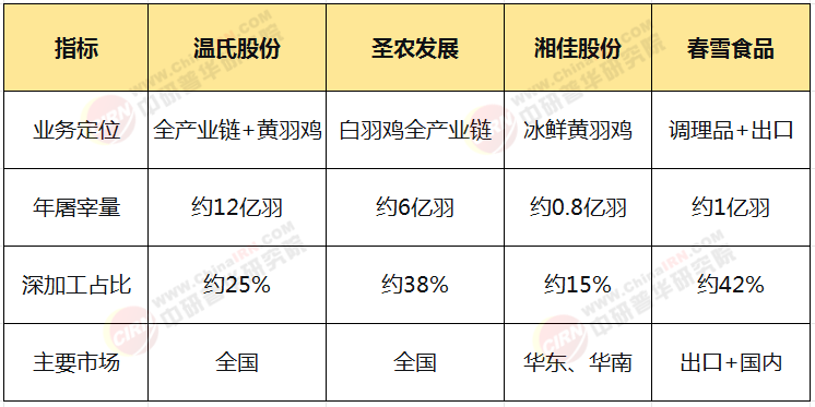 包括益生股份(种鸡优势)、民和股份(商品代养殖)、仙坛股份(加工优势)、湘佳股份(冰鲜黄羽鸡)、立华股份(黄羽鸡养殖)、春雪食品(调理品出口)等。这些企业在特定区域或细分领域建立了差异化竞争力。