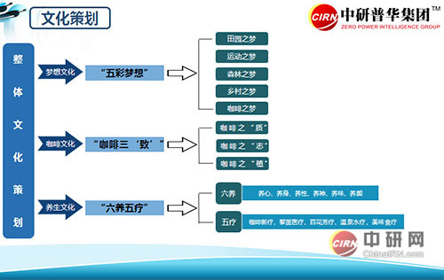 在文化挖掘上,从项目地本体资源、企业文化特色、市场文化需求三个角度综合考虑,立足资源、创意突破、传承延续、对接市场,结合国家相关政策,提出以梦想文化为轴线,以田园文化为基础,以咖啡文化为突破,以养生文化为目标,将本项目打造成为身心俱养的旅游休闲区、咖啡文化的全方位体验地以及实现梦想的心灵家园。