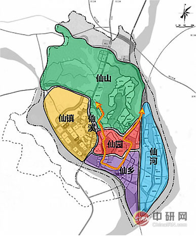 在全面分析规划地空间与资源基础上,提出“一核一带四区”的空间布局结构,打造仙园——诗仙文化朝圣核心区;仙溪——双溪游仙风情发展带;仙乡——醉仙文化休闲区;仙山——花月仙境度假区、仙河——逍遥仙河养生区;仙镇——青莲诗歌生活镇四区,形成一核引领、一带驱动、四区共进空间布局结构。