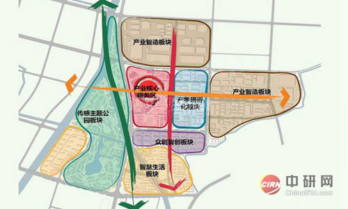 小镇将形成“一核三轴五板块”的空间结构。一核即产业服务核,以小镇客厅、传感器企业总部、智慧社区平台搭建、高端商贸、会展等功能植入为主;三轴,是指沿通江中路的三生联动发展轴、沿创新一路的跨境商贸轴和沿新苑三路的生态绿轴;五板块,分别为众创智创板块、产学研孵化板块、产业智造板块、传感主题公园板块和智慧生活板块。小镇规划打造产业核心服务区、产学研孵化区、众创智创区、智慧生活区、产业智造区和传感主题公园区六大功能片区。