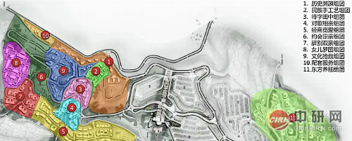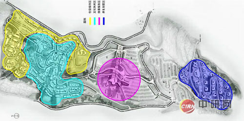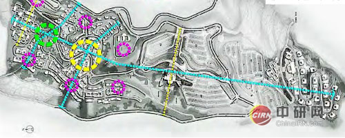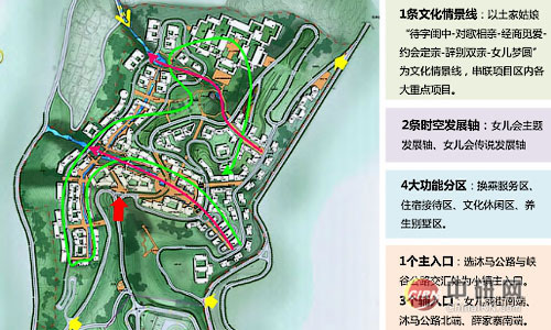 规划整体呈“一纵、四横、两心、六节点”的空间格局,结合山形地势并考虑小镇旅游的行为心理学原理,合理组织各空间板块,并充分融入恩施本土特色文化,形成两大核心旅游区和六大景观节点去,各区域通过横向及纵向的流线串联起来。
