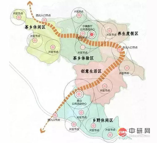 五区:规划最终形成茶乡休闲区、茶乡体验区、养生度假区、创意生活区、乡野休闲区等五大功能分区。