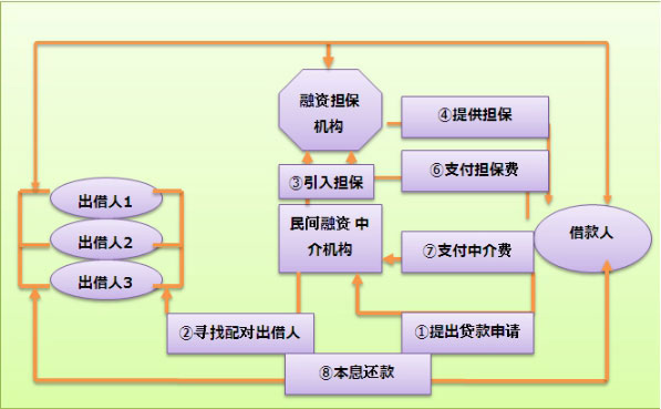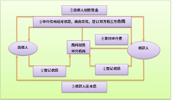 资金供需双方个人分别到中介机构登记信息,中介机构负责审核信息的真实性并进行信息配对,撮合配对成功的供需双方见面,如果谈妥,借款人提供不动产抵押,双方签订借贷合同,目前资金出借人的年收益率一般为12~15%。三方还需同时签订一份居间合同,中介机构向借款人收取3%的居间服务费,这样借款人最终将承担15~18%的融资成本。中介机构在这种模式中不从事放贷业务,出现风险时也不需要垫资,但需协助债务催收、处置抵押物等工作。这种模式较为初级,一般交易额较低(多为100万以内),期限较短(一年以内),风险比较容易控制,资金出借人的收益率也较低,在其他收益率更高的中介模式影响下,这种模式容易遭遇发展瓶颈。