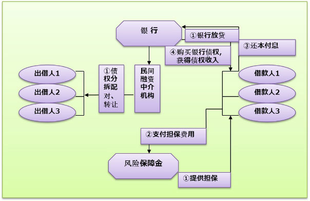 二是购买银行债权再转让。这种模式有银行和担保机构参加,目前见于车贷业务。自然人向银行提出贷款购车申请,由担保公司提供担保,银行发放车贷,中介机构向银行购买部分车贷债权,然后再以理财产品形式向自然人转让。自然人出借资金的收益率可达到12%以上,购车人付出的成本为担保费、银行贷款基准利率上浮,中介机构收入为不低于4%的债权转让利差以及部分资金收回再贷产生的复利收入。