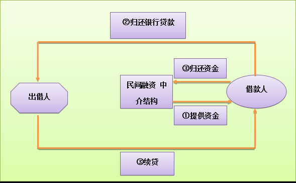 过桥贷是指借款人在自有资金不足的情况下,通过民间融资中介机构筹措资金归还银行到期贷款,待重新取得银行贷款后再偿还这部分融资的一种模式。在这种模式中,借款人急需资金,中介机构通常直接充当放贷人,放款期限较短(一般为银行贷款审批流程的时间),因此资金价格非常高,通常可达到月息3~6分甚至更高。中介机构过桥贷模式在市场中非常普遍。