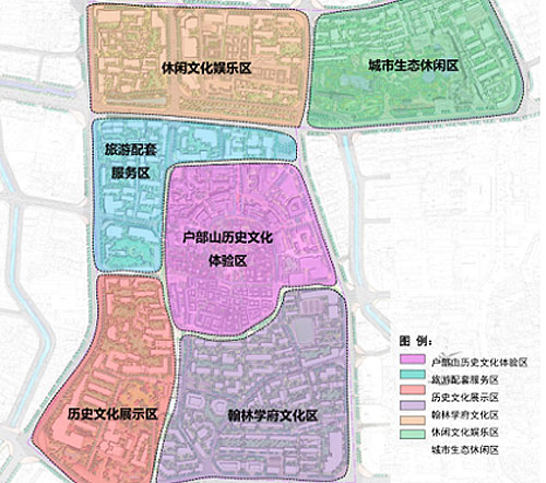 户部山根据各部分功能的不同将整个项目划分为:户部山文化体验区、户部山历史文化展示区、休闲文化娱乐区、城市生态休闲区、旅游配套服务区和翰林学府文化区六大区域。